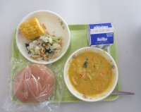 献立 黒パン 牛乳 かぼちゃのシチュー レモンドレッシングサラダ トウモロ...