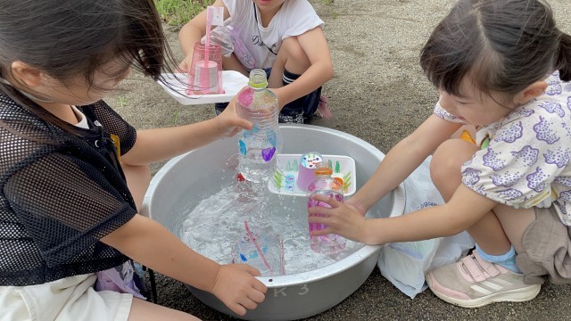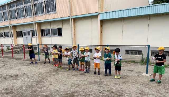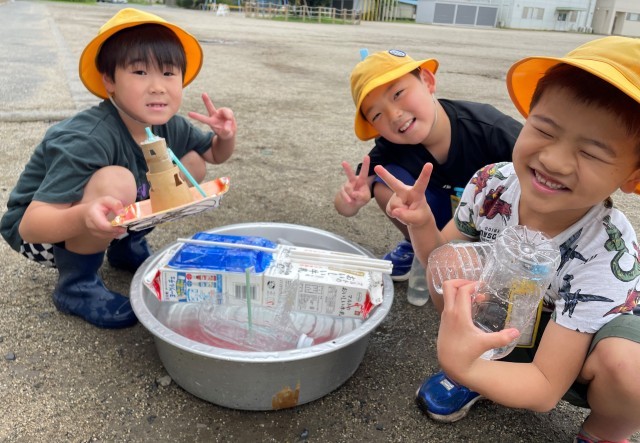 716日に1年生は生活科の時間につくったふねと水でっぽうの作品で遊びました。