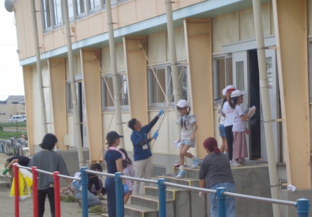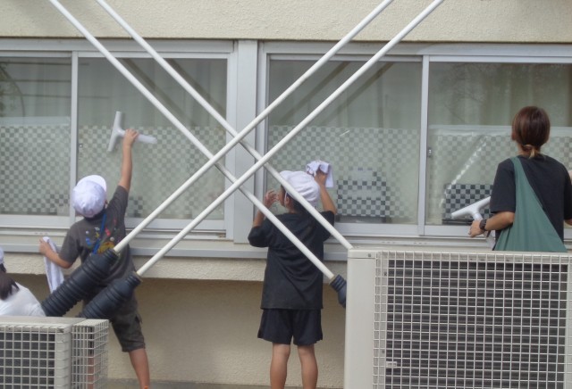 体育館の掃除や窓掃除、除草を親子で行いました。