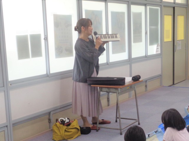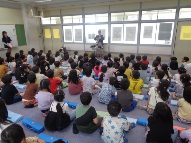まず「大きなのっぽの古時計」を先生が演奏してくださいました。きれいな音色が音楽室にひびきわたり、子どもたちはとても感動して聴いていました。