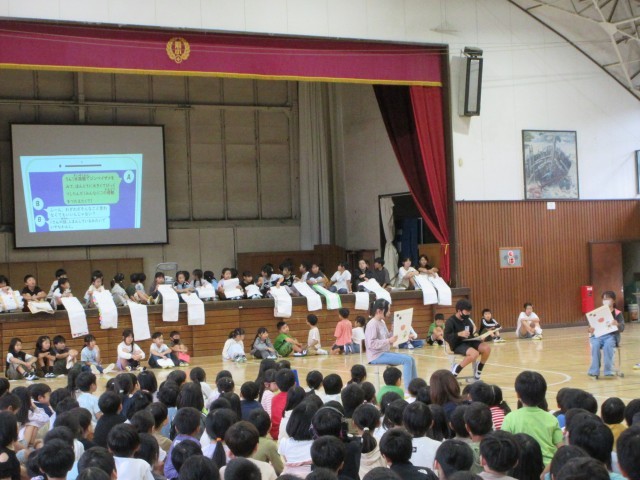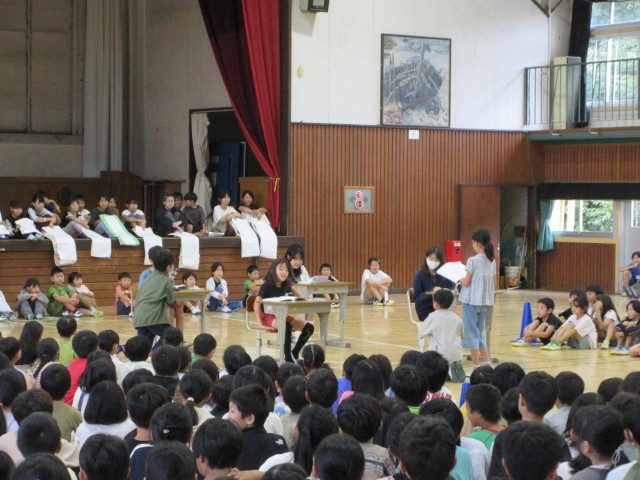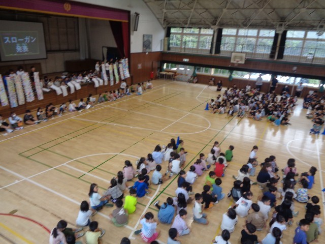 「いじめ撲滅フォーラム」が開催されました。代表委員会による寸劇や、各クラスで考えたスローガン発表を通して、前渡小の全員で「いじめ」について考えました。