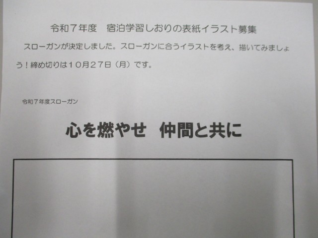 第5学年では、宿泊学習のスローガンが決定しました。現在、決定したスローガンをもとにしおりの表紙等に使用するイラストを募集しています。素敵なしおりができるように実行委員が中心となり、熱心に活動をしています。