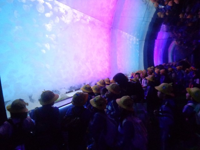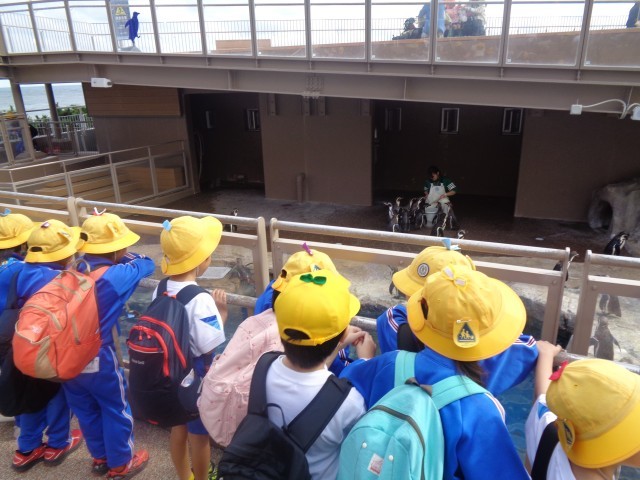 ショーのあとには、館内を見学しました。サメやエイなどの大きな魚から、色とりどりの小さな魚、かわいいペンギンやカメまで、たくさんの生きものを間近で見ることができました。「この魚は、○○だよ!」「ペンギンが泳ぐの早いね!」「クラゲがきれいだね」と、興味津々で観察する姿が印象的でした。