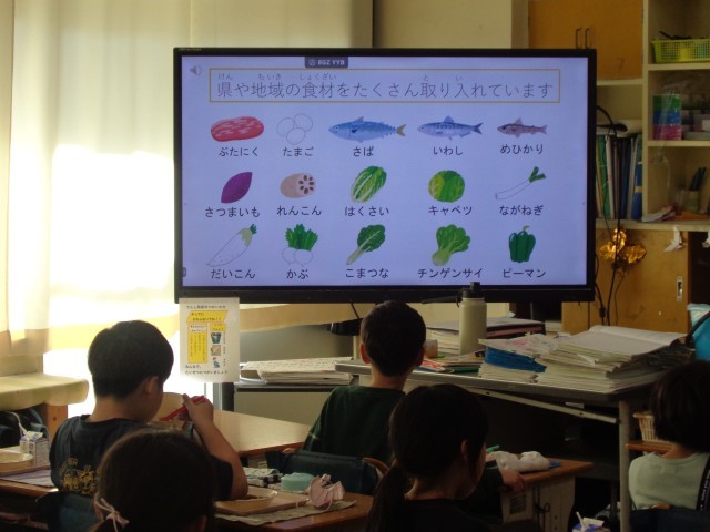 子どもたちは、給食の時間に動画を見て、茨城県の食材や、めひかりについて学びました。