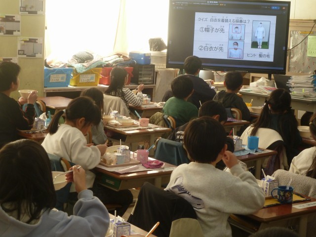 今日は給食の時間に、給食室や調理員さんの衛生管理についての動画を見ました。