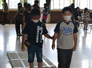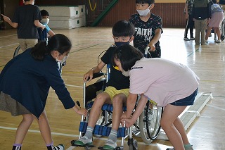 4年生が総合的な学習の時間に、社会福祉協議会の方にご指導をいただき、車いすに乗る体験をしました。また、アイマスクを付け、声を掛け合いながら障害物を越えていく体験をしました。貴重な経験になりました。これからも福祉体験を通して、多くのことを学んでいきます。