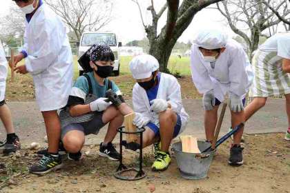 かまどの火起こし担当の子どもたちは、「薪割り」から取り組みました。割り箸2本分ほどの大きさになるように、薪割り器を活用して一生懸命活動しました。昨日のキャンプファイヤーの中央にある櫓を小さくして、かまどの中には、「ミニ櫓」をつくるイメージで準備をしました。マッチの擦り方も、擦る方向やマッチの角度などに気を配りながら安全にできるように心がけていました。火をつけてからどんどん燃やしていくことに難しさを感じている児童もなかなか多かったようです。火がついても、どうしても弱まってしまうところをなんとかつなぎ、大きくしていく…しかし、どの班も頑張って活動しました。この下準備ができれば、ご飯担当とカレー作り担当に良い状態で料理のバトンをつなげます!