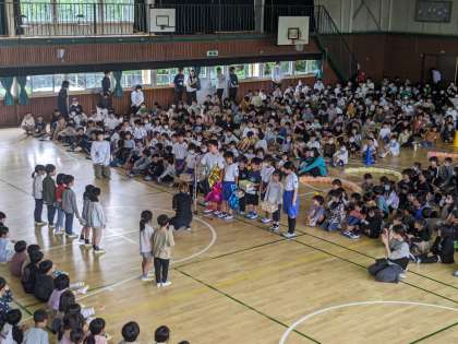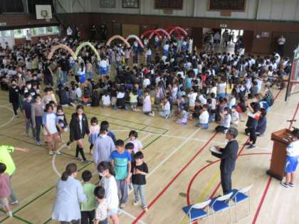 1年生は、手作りの花のアーチの下を6年生のお兄さんお姉さんと手をつないで、少し緊張気味で体育館に入場してきました。2年生以上は、温かい拍手で迎えてくれました。児童代表歓迎の言葉の中で、小学校の楽しさをたくさん知ることができた1年生たちは、ほっとした表情になっていました。次に、2年生全員で、昨年育てた朝顔の種を「だいじに、そだててね。」と言いながら、代表の1年生に渡すと、「ありがとうございます。」とお礼を言って、笑顔で受け取ることができました。夏には、きれいな朝顔を咲かせて欲しいと思います。