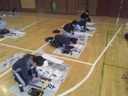 本日は、3時間目に書き初め会を体育館で行い、3年生の課題は「友だち」でした。冬休み中に一生懸命お家で練習した様子が見られました。子どもたちは、お手本を見ながら、一文字一文字集中して字と向き合っていました。書いた字に納得がいかず、「もう一枚、次は成功するように頑張る。」と意気込んで書いている姿も見られました。最後に今まで書いた中で一番うまく書くことができた人と先生が質問すると、数多くの子どもたちが手を挙げていました。校内書き初め展の展示期間は、14日(火)〜17日(金)の午後3時から午後4時30分となっております。ぜひ、ご覧ください。