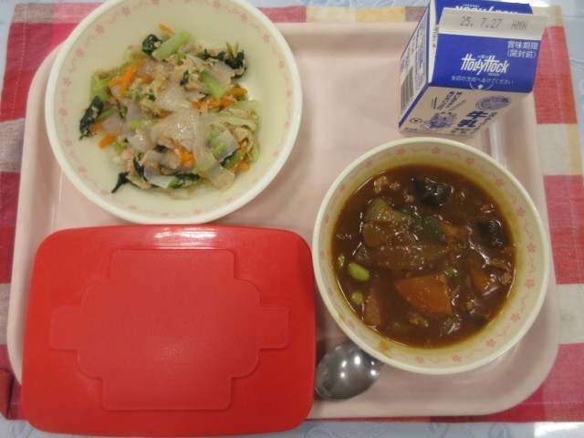 【献立】ごはん 牛乳 夏野菜カレー こんにゃくサラダ