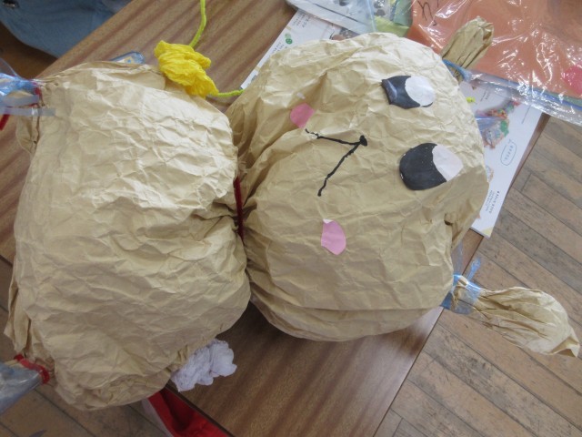 大きな紙袋の中に、新聞紙などを丸めて中に詰めて、子供たちは自分がつくりたい「動物」をカタチ作りました。