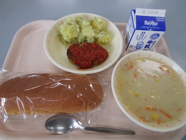 【献立】はちみつパン 牛乳 ハンバーグトマトソース こふきいも 米粉と豆乳のコーンポタージュ