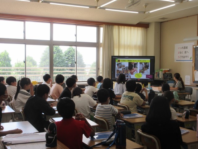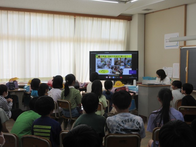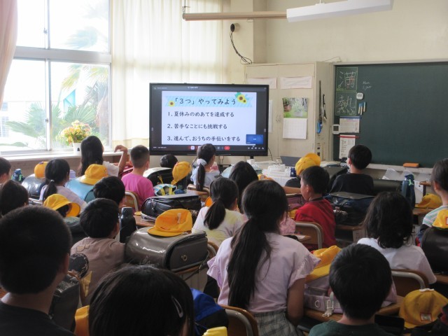土日と海の日があるため、子供たちにとっては、明日から休みに入る感覚です。夏休み前、最後の登校日は、今年度から暑さ対策として「オンライン集会」に切り替えました。涼しい教室での実施だったので、子供たちは、校長先生と生徒指導主事の先生の話を、集中して聞くことができました。