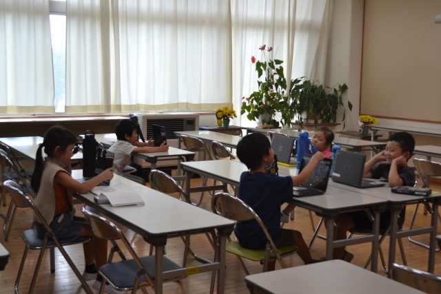 学級の児童と担任がオンラインでつながり、健康観察や夏休みの過ごし方、宿題の状況を確認をしました。総合的な学習の時間の中間発表や調べ学習の様子を話す時間もありました。学級ごとに友達や先生の元気な顔が見られて、楽しい時間になりました。学校学童の低学年児童は、一つの部屋でオンラインをつなぎました。