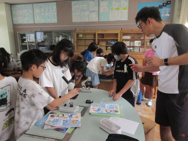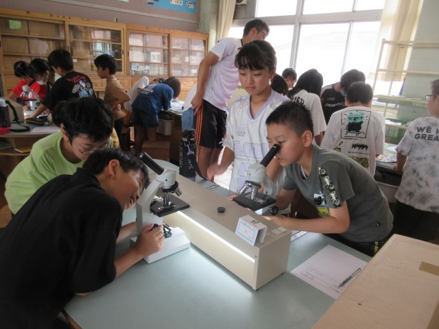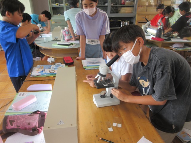 5年生の理科では、グループで採取した花粉を顕微鏡で観察し、花粉の様子を調べワークシートにまとめていました。