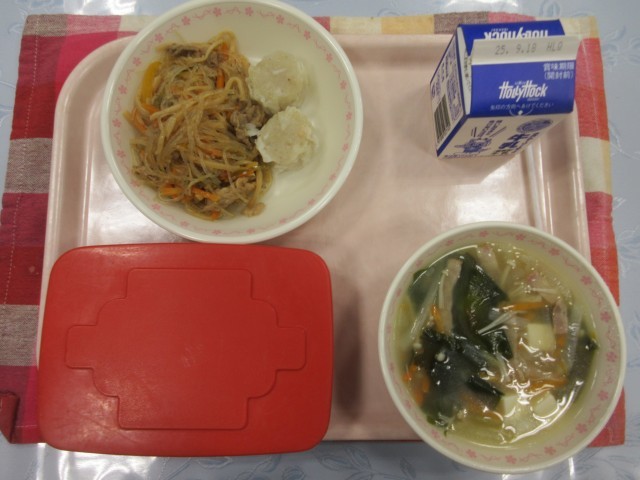 【献立】ごはん 牛乳 えびしゅうまい 春雨のカラフル炒め わかめスープ