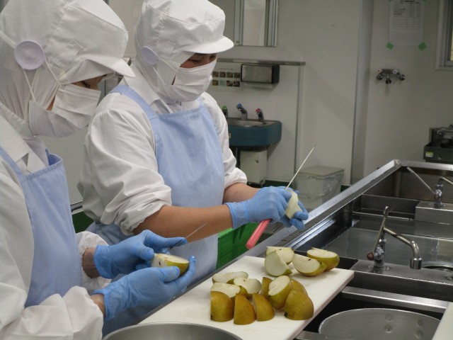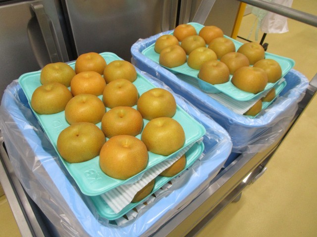 梨の季節です。茨城県は梨の生産が多く、主に県西地域でたくさん収穫されます。豊かな水、恵まれた土壌、昼と夜の寒暖差が大きい気候が梨の生産に適しています。梨の種類として、幸水、豊水が多いですが、新種も多くあります。あきづき、新高、にっこりなどおいしい梨が続きます。今日の梨はどの種類でしょうか。味わってみましょう。