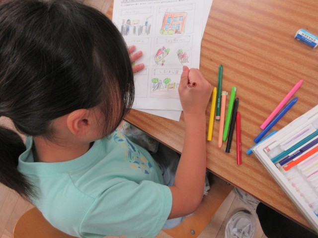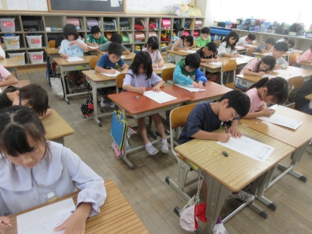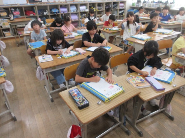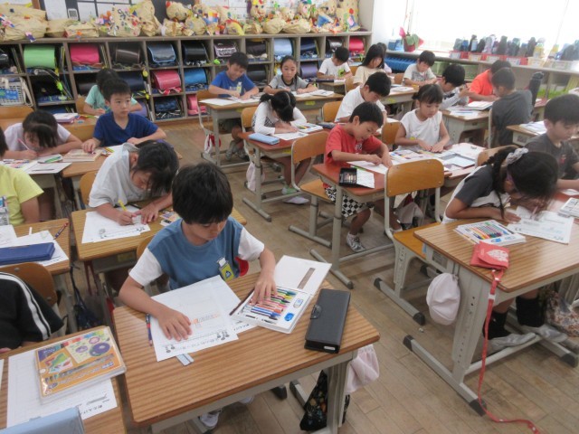 主任児童員、民生委員のかたがたにもご協力を得て、探検に行って学校に戻ると、とにかく夢中になって、見た来たこと感じたことをワークシートにアウトプットすることに誰もが集中していました。まさに、没頭して書きしるしていました。
