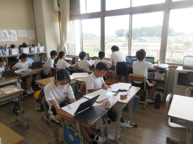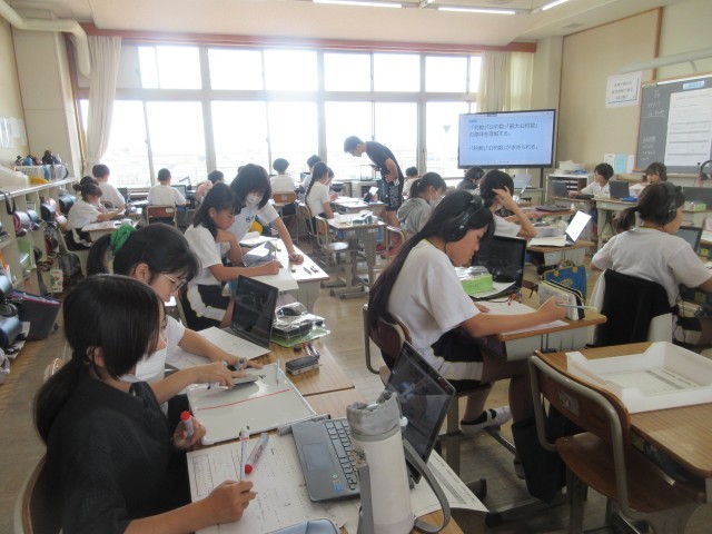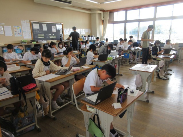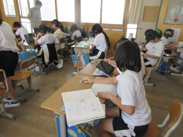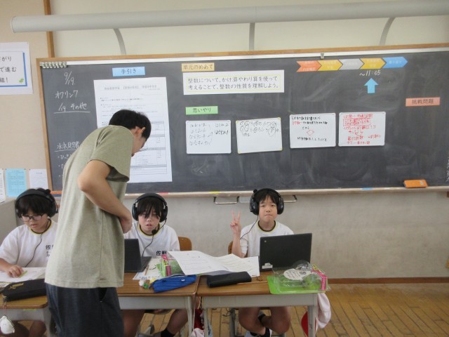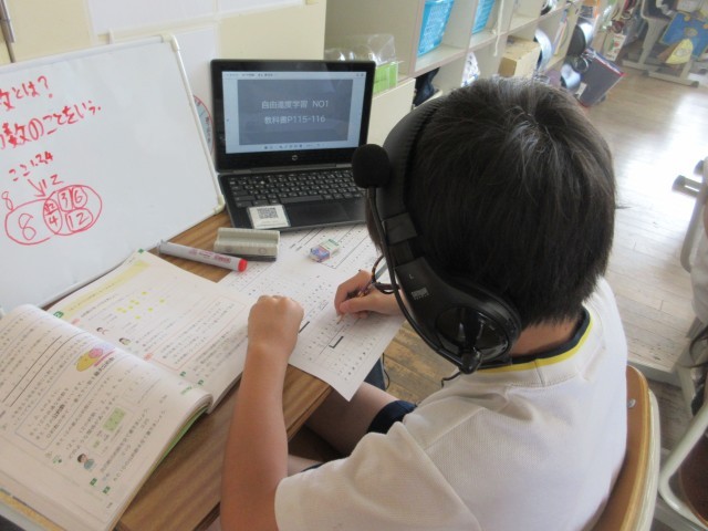 子供たちは、自分の学習スタイルを選択し、本時の課題達成に向けて取り組んでいました。自由進度型の学習なので、一人で黙々と学習を進める児童や、気になったことを横並びの友達に相談する児童、グループで解決する児童、学習動画を見ながら解決する児童と様々です。