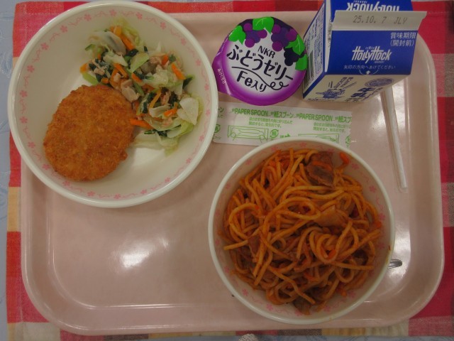 【献立】スパゲッティアラビアータ 牛乳 コロッケ 小松菜サラダ ぶどうゼリー