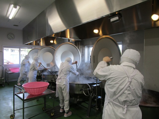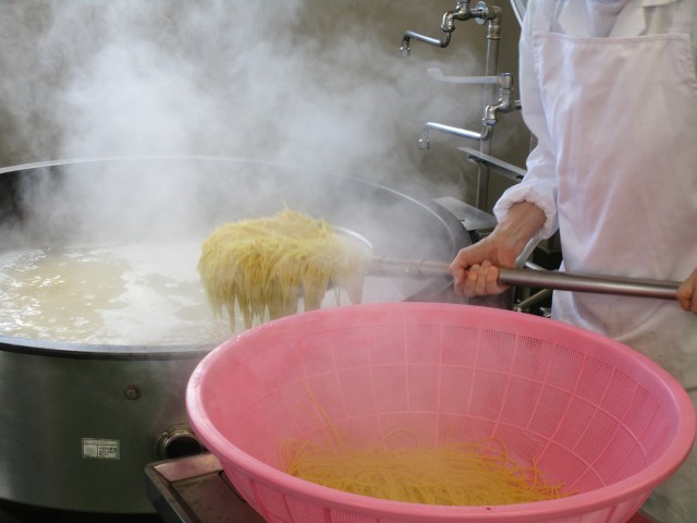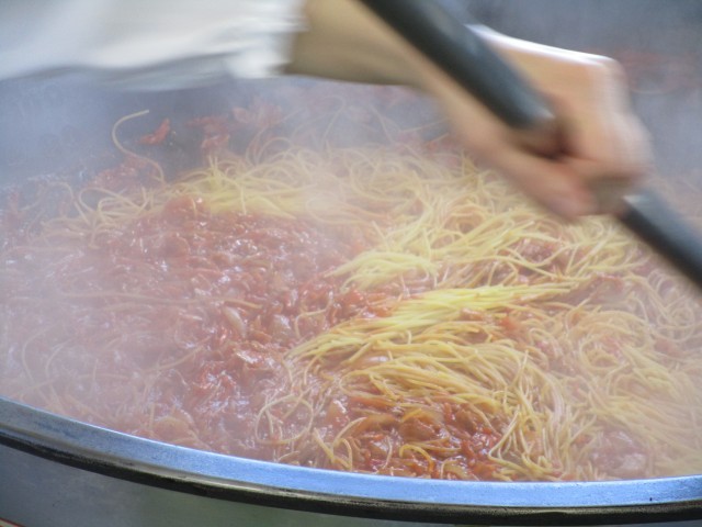 米写真は、乾麺のパスタをゆで、ソースに絡めていく工程の様子です。
