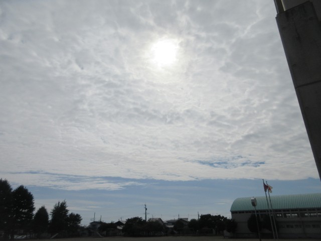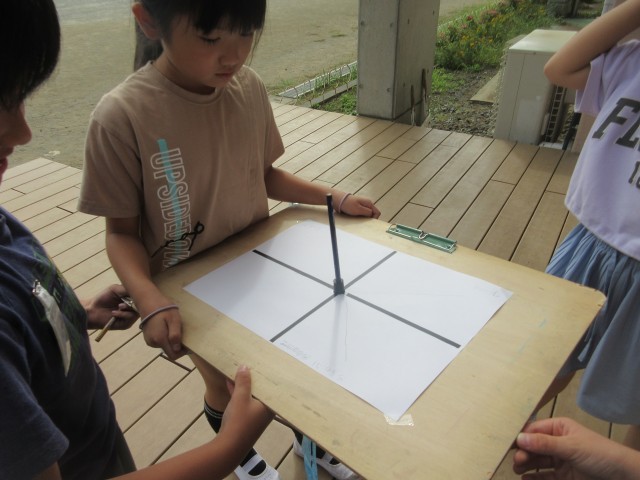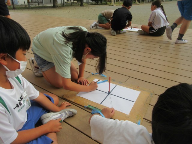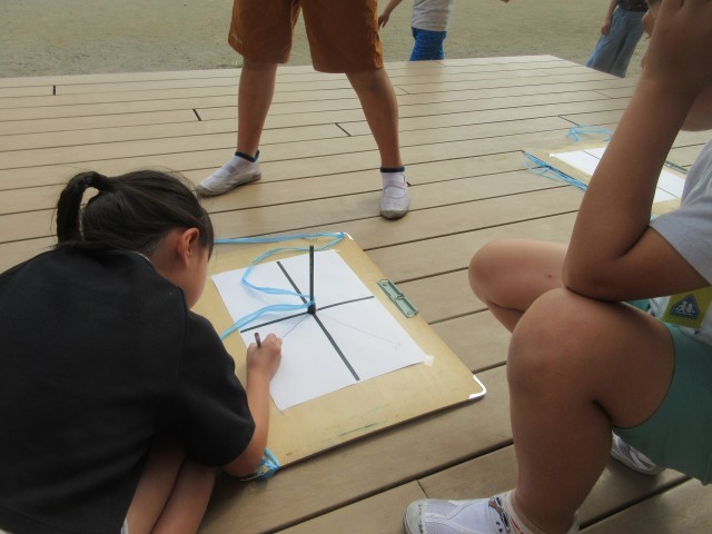 単元「地面のようすと太陽」の学習で、本時は「太陽の位置を、時刻と⽐べながら調べる。」観察をしていました。1時45分頃に観察に来た子供たちは、「太陽が雲にかかっているから、陰が薄いな~。」といいながら、陰の位置と長さを記していました。班のシートを見て、午前の記録と午後の違いに気付き、友だちとそのことを話しながら、教室に向かって考察の続きをしていました。