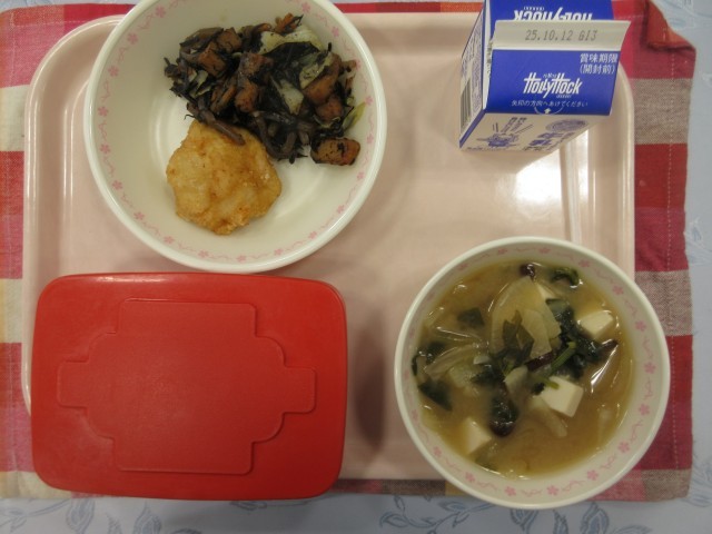 【献立】ごはん 牛乳 鶏肉のから揚げ ひじきの炒め煮 なめこ汁
