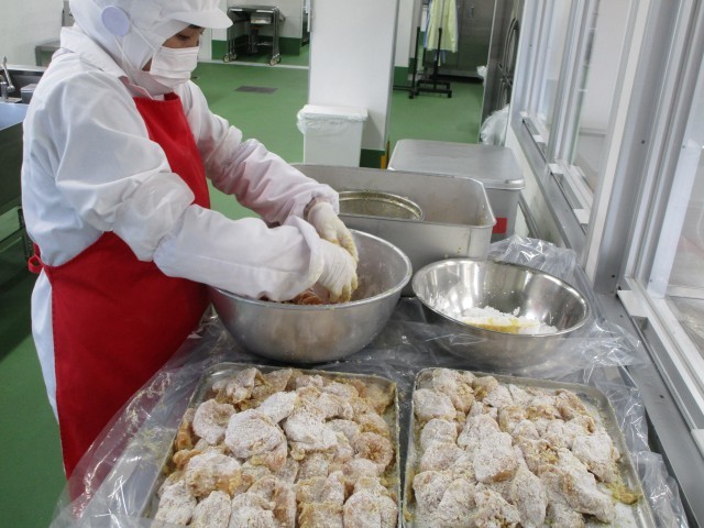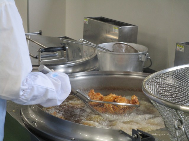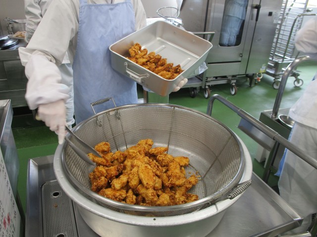 写真のように、たくさんの唐揚げを付くためには、手際よく衣を付け、油で揚げなければなりません。調理員の先生方は、作業を分担して、効率よく作業を行っています。