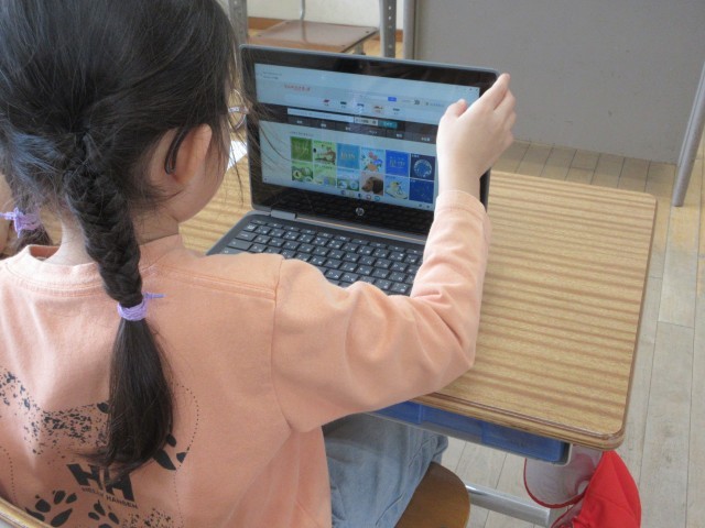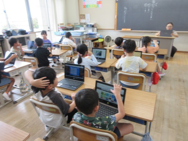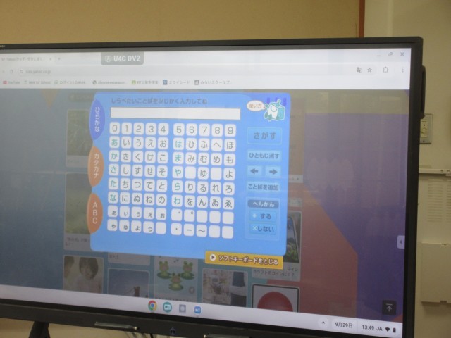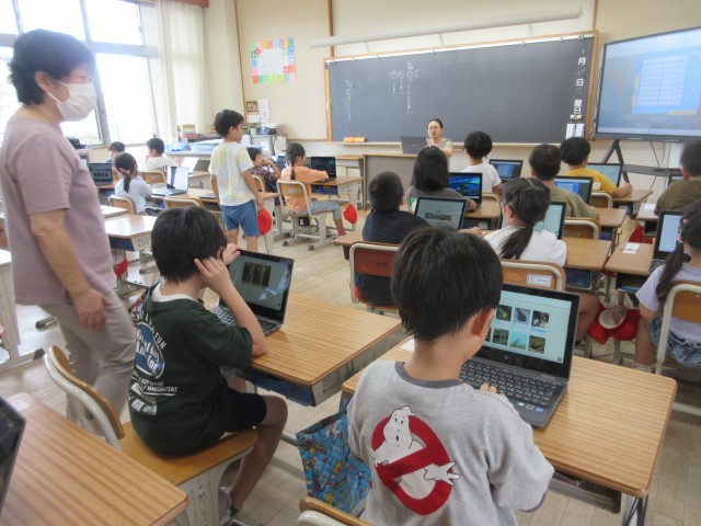 1年生は、五十音表を使って、文字入力をしています。今日は、子供たちが実際に捕まえた昆虫やもっと知りたい昆虫について、検索をしていました。