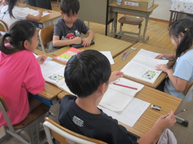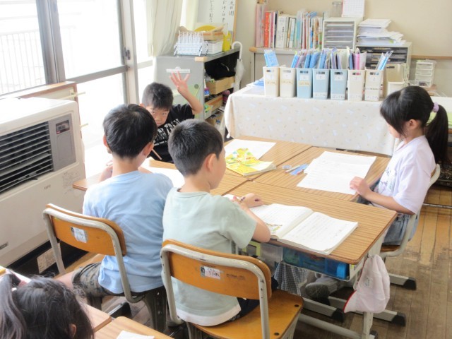 本時の課題にせまるために、子供たちは、獣医さんが仕事をしている「わけ」と「くふう」について、それぞれが考えた意見を出し合っていました。また、グループの体型になると、子供たちは、互いに意見を伝え合い、活発な意見交換をしていました、