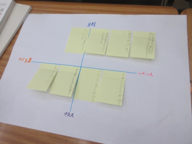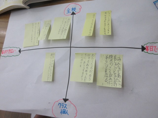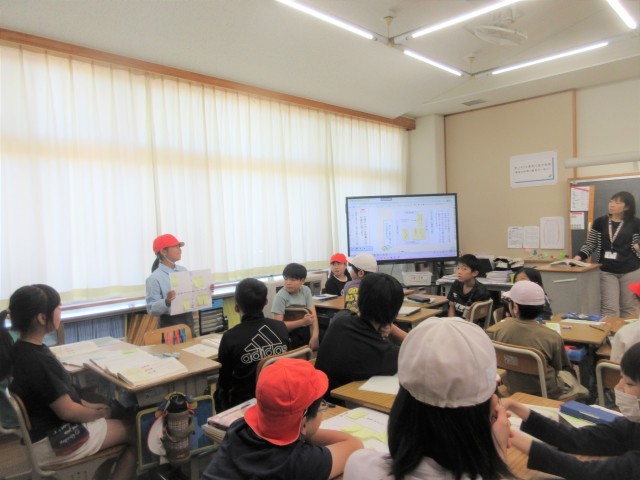 5年「国語」の『よりよい学校生活のために』の学習で、班ごとに話し合ったことを根拠に基づいて、共有し合っていました。