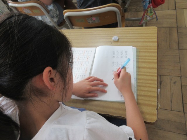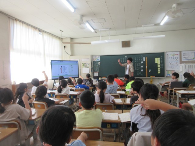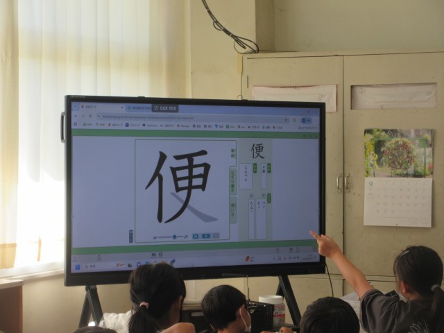 4年「国語」で新出漢字の確認を行っていました。漢字を正しく覚えるために、電子黒板に示された漢字(動画)を見ながら、指を使っ練習していました。