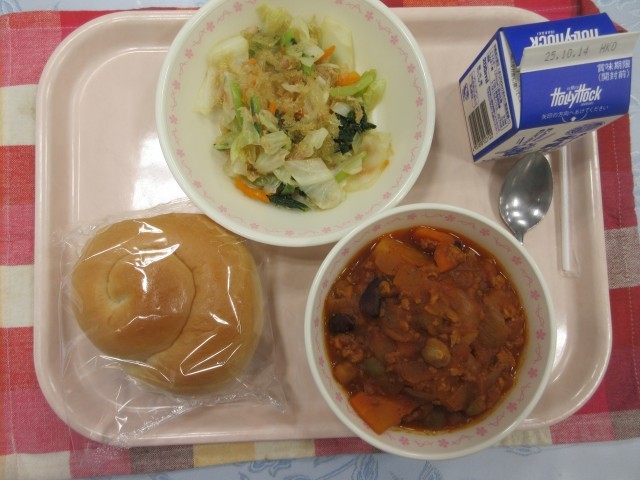 【献立】ミルクパン 牛乳 チリビーンズ 寒天入りヘルシーサラダ