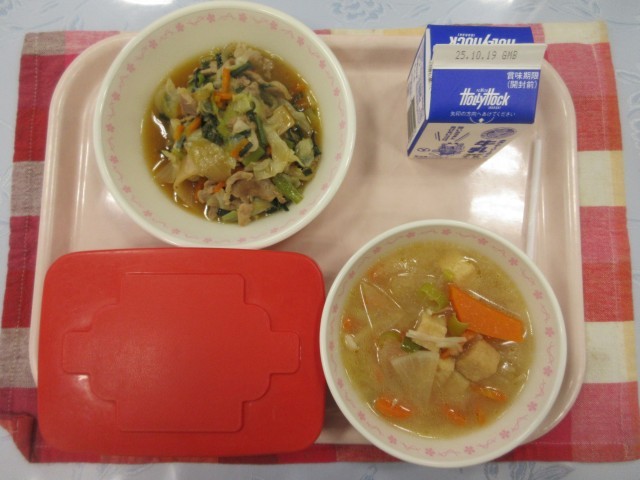 豚肉には、血や筋肉をつくるもとになる良質なたんぱく質や体の疲れを回復するために必要なビタミンB₁が含まれています。ビタミンB₁はごはんやパンなどに含まれている炭水化物をエネルギーにかえる大切な働きをしています。ビタミンB₁が不足すると勉強に集中できなくなったり、疲れがたまりやすくなったりします。今日は豚肉のスタミナ炒めです。しっかり食べて丈夫な体をつくりましょう。