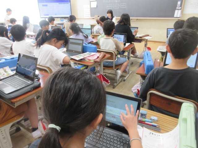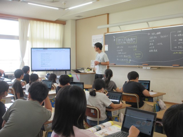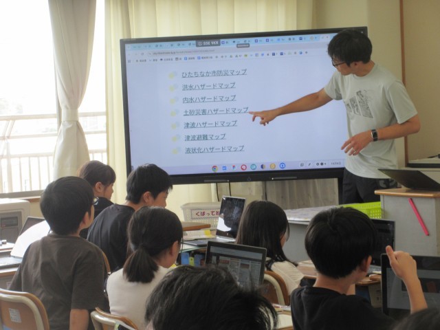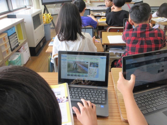 理科では、様々なハザードマップを比較しながら、どのようなことが分かるのか調べていました。
