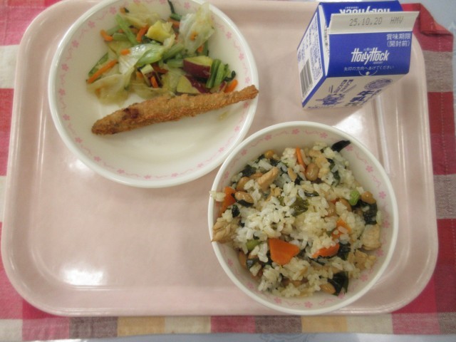 【献立】わかめ五目ごはん 牛乳 ししゃもフライ さつまいものガーリックサラダ