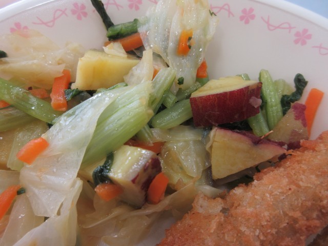 さつまいもは5月頃に苗を1本ずつ手作業で植えて育て、9月頃に収穫をします。たくさんのさつまいも畑がある、ひたちなか市でも、さつまいもの収穫が始まっています。学校給食でも9月から冬場にかけて、ひたちなか市産のさつまいもを給食に取り入れています。今日はさつまいもを使ったサラダにしました。さつまいもは体の調子を整える「食物繊維」や、みかんと同じくらい「ビタミンC」が豊富で、加熱しても壊れにくい形で含まれています。地元でとれたさつまいもを味わいましょう。