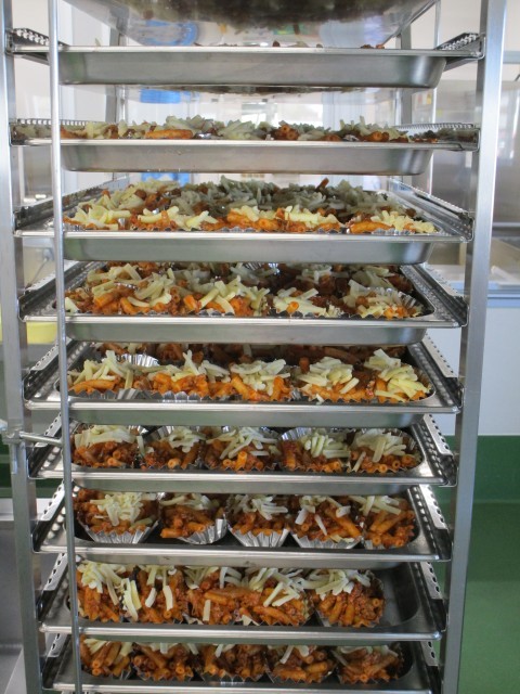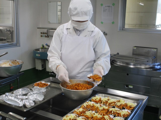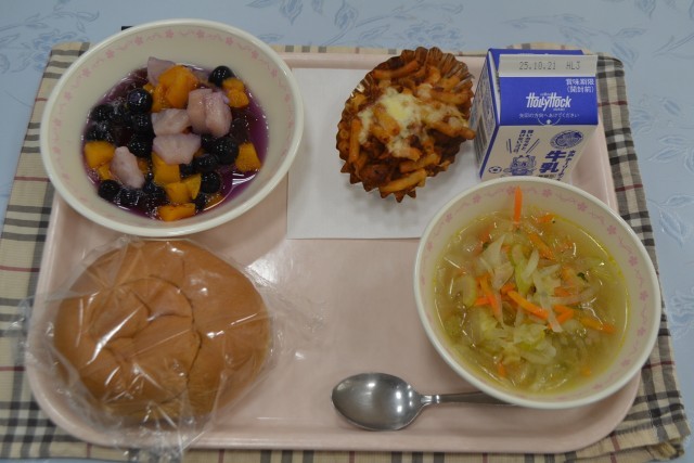 【献立】黒パン 牛乳 ミートグラタン ジュリエンヌスープ ブルーベリーフルーツポンチ
