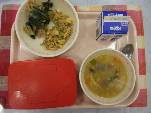 【献立】ごはん 牛乳 いろどり肉そぼろ おかかあえ みそけんちん汁