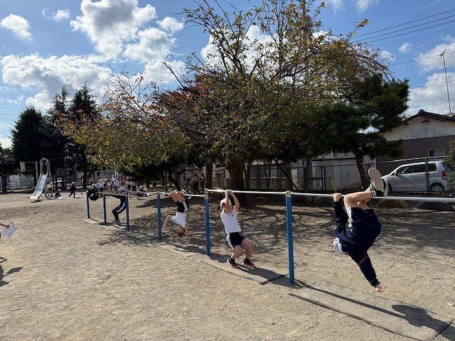 体育係の声かけで、体操をして、トラックを走って、今日の学習「鉄棒」に取り組んでいる子供たちです。