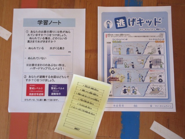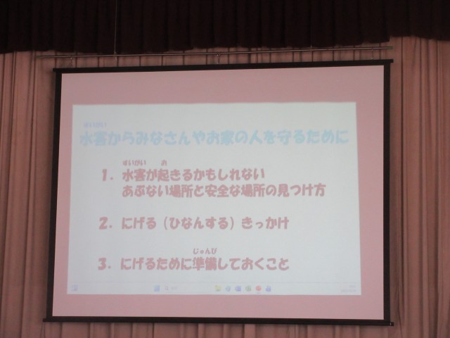 マイ・タイムラインを作って、自分の行動を考えることができました。佐野小は、河川に近い場所ではないのですが、大雨が降ると冠水する地域があることから、子供たちは、水の怖さを想像しながら、講話をしっかり聞くことができました。