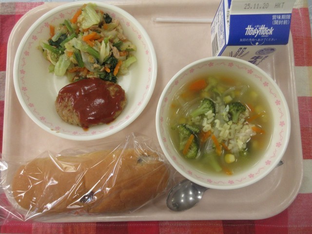 【献立】レーズンパン 牛乳 ハンバーグデミグラスソース オニオンドレッシングサラダ ABCスープ