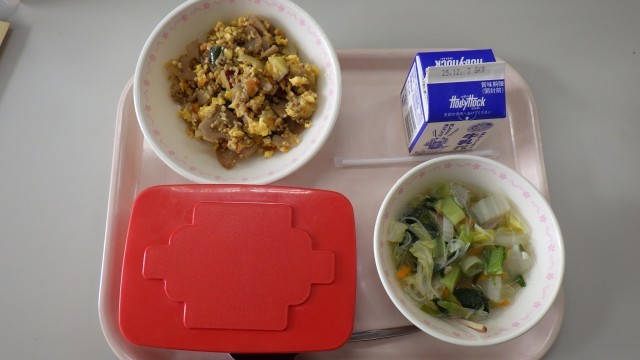 【献立】ごはん 牛乳 カリ!シャキ!いばらきガパオ 春雨スープ