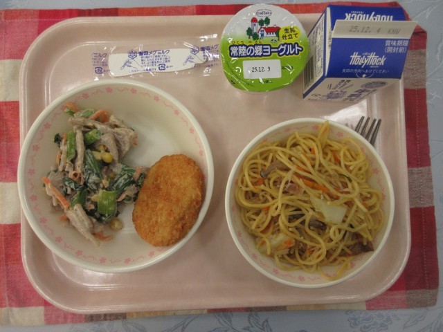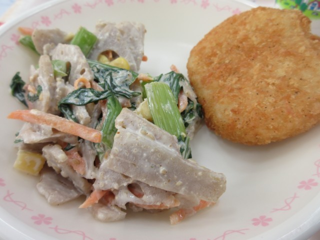 【献立】しらすのペペロンチーノ 牛乳 コロッケ れんこんサラダ ヨーグルト