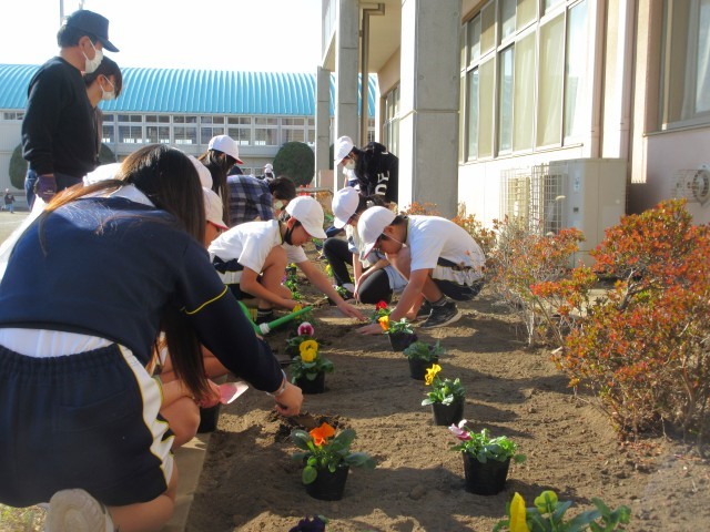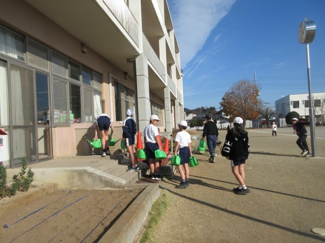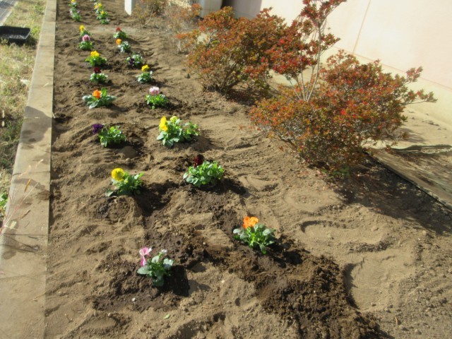 昼休みの時間帯に、栽培福祉委員会の児童は、パンジーの苗植えのためにグラウンド側花壇の前に集合していました。