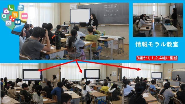 これまで,学年全体で講話を聞く際には、体育館で行うことが多かったのですが、タブレットと電子黒板を活用して、3組で講師の先生にお話ししていただいている様子をオンラインで配信して、全学級で学習をしました。