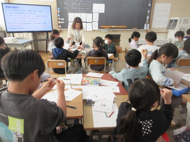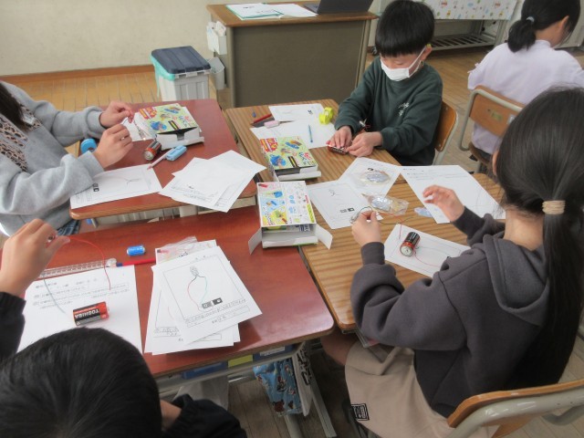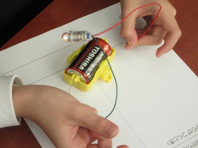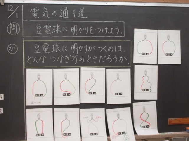 『豆電球にあかりがつくのは、どんなつなぎたかのときだろうか。』という課題です。前もって、豆電球が点灯する繋ぎ方を子供たちは何通りか考え、その予想が正しいかどうか、実験を通して検証しました。