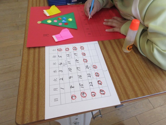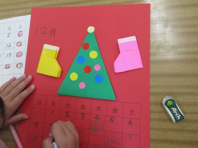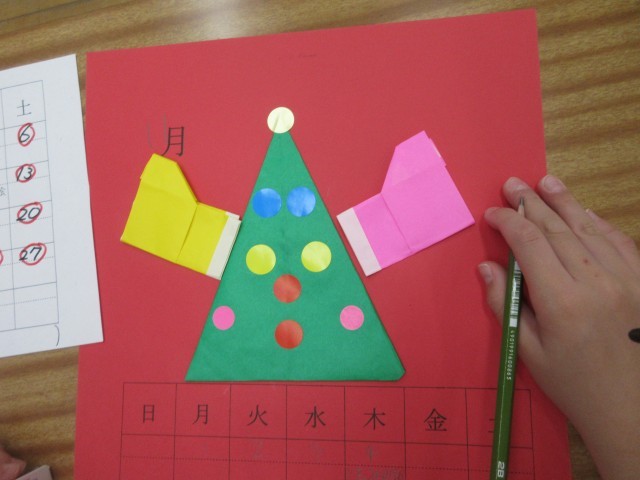 また、「自立活動」では、クリスマスツリーとブーツを折り紙で折り、12月らしいカレンダー作成に熱心に取り組んでいました。