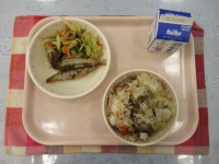 【献立】和風スパゲッティ 牛乳 たらのあおさフライ チキンサラダ