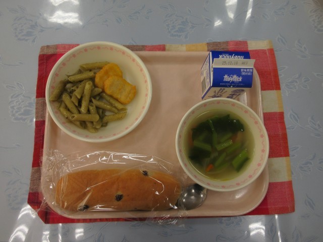 【献立】レーズンパン 牛乳 チキンナゲット ペンネバジルソース 豆とポテトのスープ